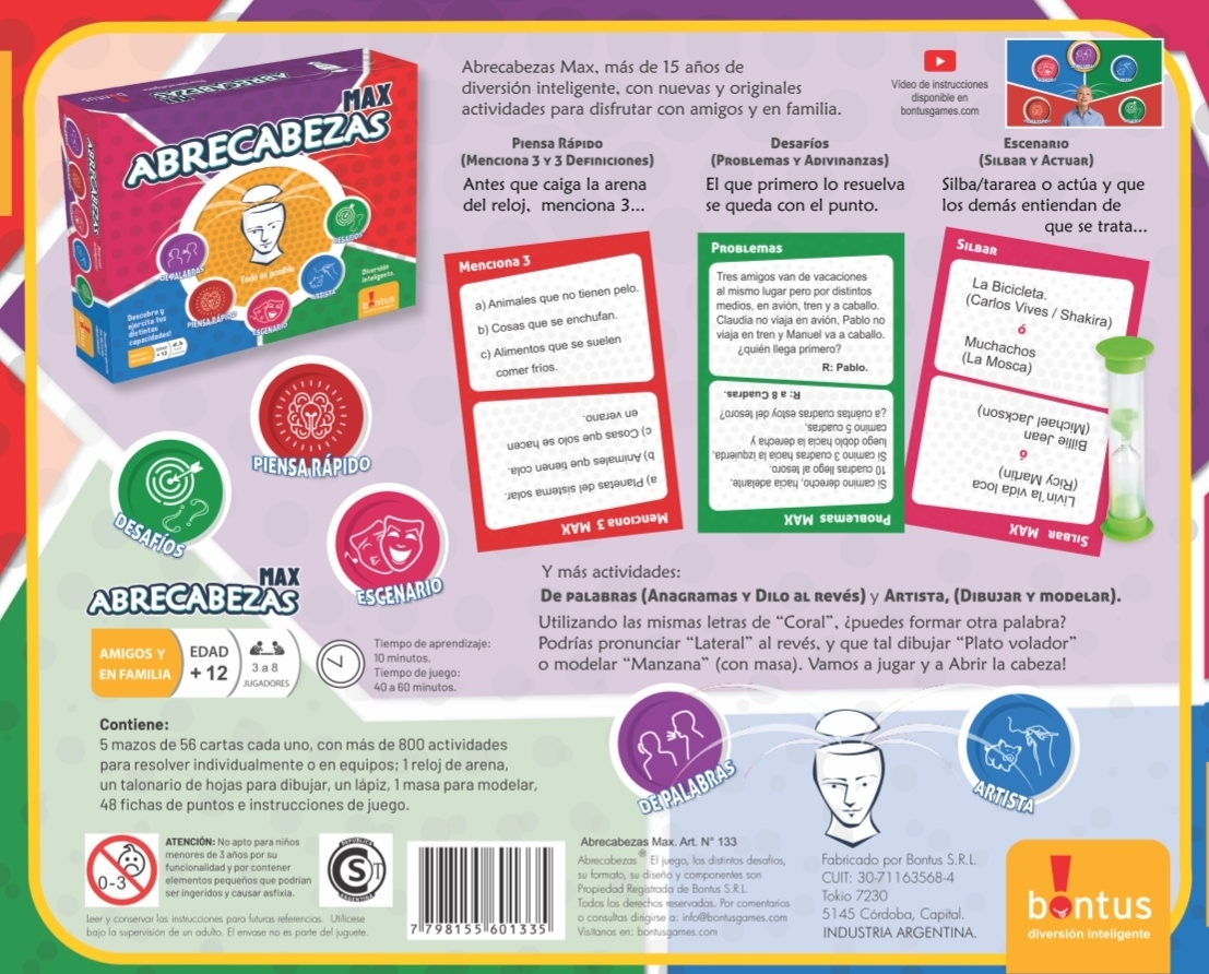 Celebrando orgullosamente más de 15 exitosos años de promover en muchísimos hogares la diversión inteligente ininterrumpida, llega la espectacular y colosal edición Abrecabezas Max. Si el juego original ya te parecía un gran desafío para tus reuniones, prepárate para multiplicar esa experiencia por mil: esta monumental caja ha sido completamente recargada de nuevas y originales actividades alocadas pensadas exclusivamente para disfrutar a carcajadas junto a un gran grupo de amigos y de toda tu familia sin excluir a nadie.