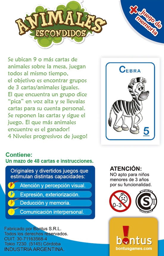 Animales Escondidos es un dinámico juego de percepción visual que pone a prueba la agudeza de los más chicos. Se ubican 9 o más cartas de animales sobre la mesa y todos los jugadores compiten al mismo tiempo: el objetivo es encontrar grupos de 3 cartas con el mismo animal lo más rápido posible.