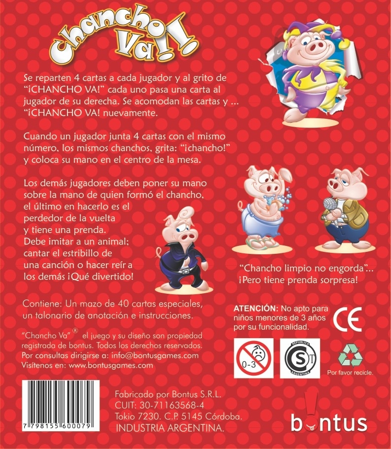 ¡El clásico e infalible juego del chancho ha evolucionado! Ahora se juega con verdaderos, divertidos y extravagantes chanchitos. Prepárate para poner a prueba tus reflejos, tu atención y tu velocidad en este vertiginoso juego de cartas en el que nadie quiere quedarse atrás.