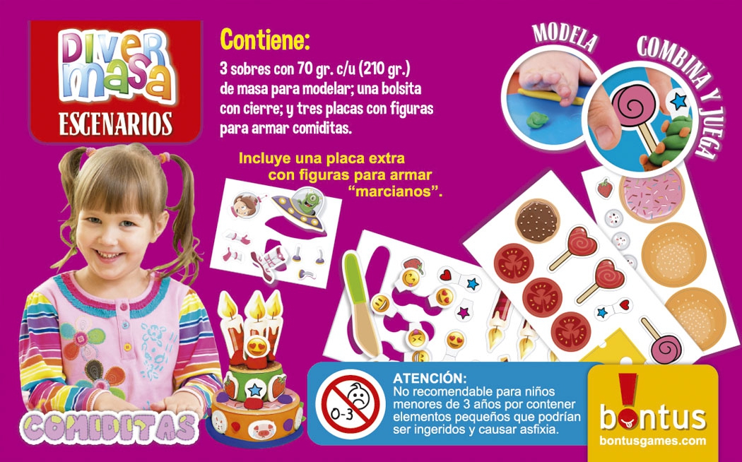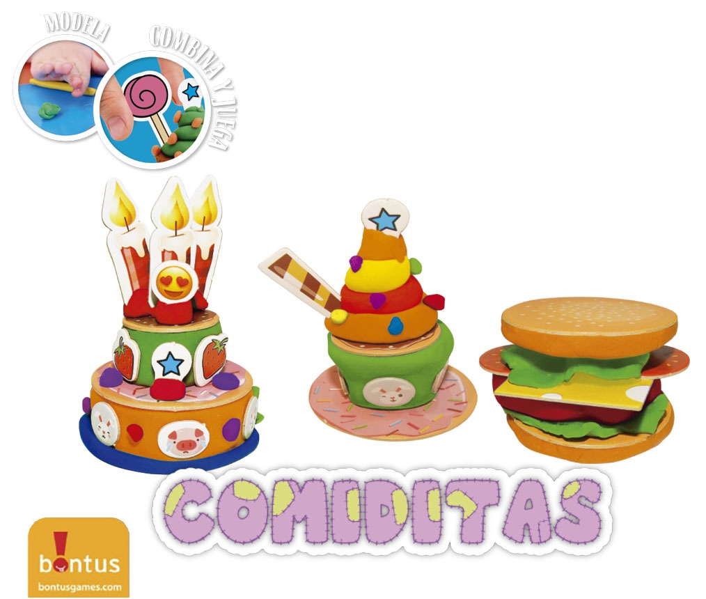 Comiditas es un set de Divermasa temático que guía a los más chicos en la creación de adorables comiditas de masa. Las placas con figuras sirven como guía visual para que los pequeños artistas sepan exactamente cómo modelar cada alimento, desde hamburguesas y helados hasta frutas y verduras.