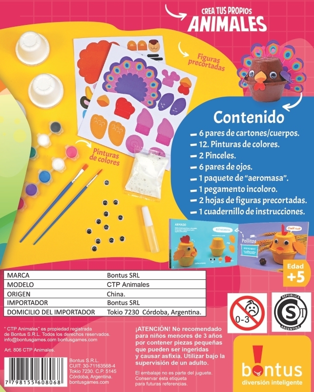 Crea tus propios Animales es un completo kit artístico que permite a los chicos armar, pintar y personalizar 6 adorables animales desde cero. Cada animal comienza como un par de cartones que se ensamblan para formar el cuerpo tridimensional, y a partir de ahí la creatividad toma el mando.