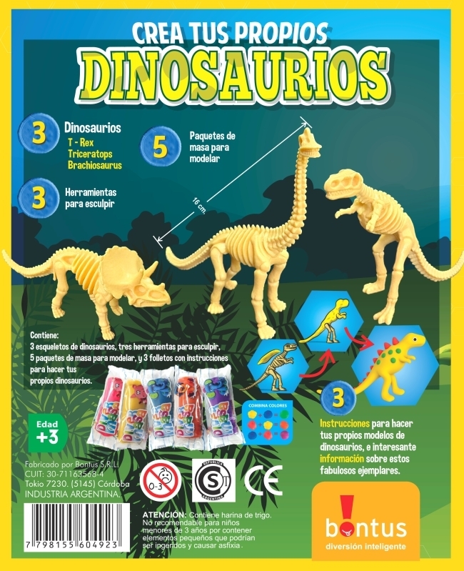 Crea tus propios Dinosaurios es una experiencia de arte y ciencia que combina el modelado creativo con el aprendizaje paleontológico. El set incluye tres esqueletos de los dinosaurios más icónicos — T-Rex, Triceratops y Brachiosaurus — que los chicos deben envolver con masa para modelar, reconstruyendo la apariencia de estos fascinantes gigantes prehistóricos.