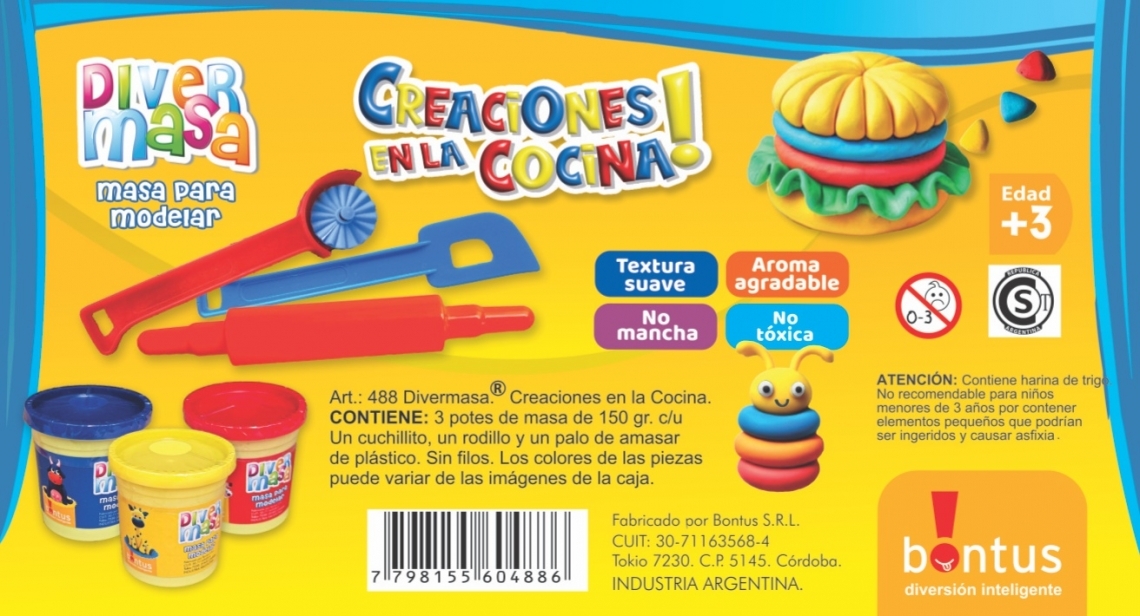 Creaciones en la Cocina transforma la mesa de juegos en un divertido taller gastronómico en miniatura. Con tres potes de Divermasa de textura suave y aroma agradable, más un completo set de utensilios de cocina de plástico seguros, los chicos pueden dar rienda suelta a su imaginación culinaria sin ningún riesgo.