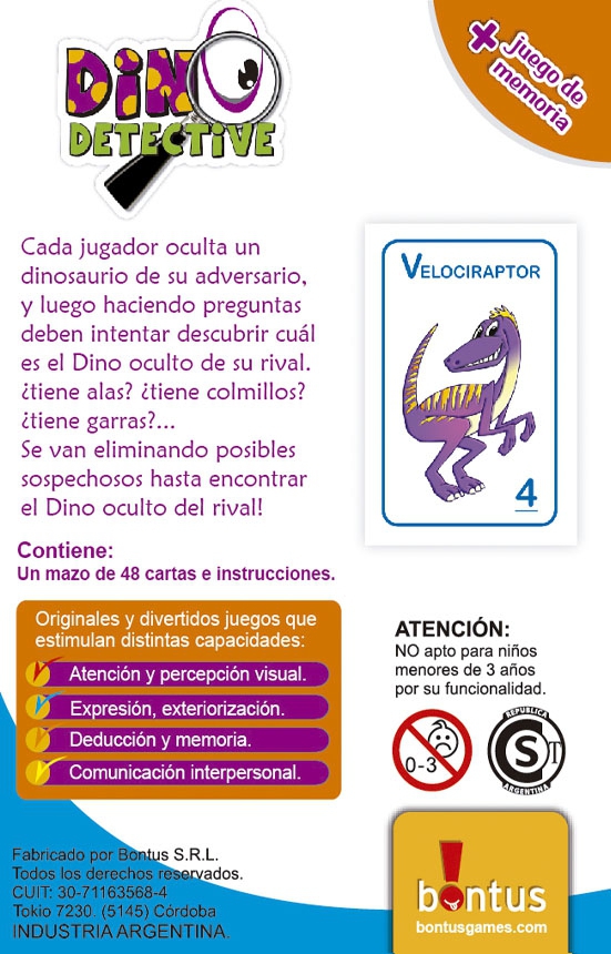 Este juego estimula de manera natural capacidades fundamentales en el desarrollo infantil: la atención y percepción visual, la deducción lógica, la memoria y la comunicación interpersonal. Con 48 cartas bellamente ilustradas con dinosaurios únicos, cada partida es un misterio nuevo por resolver. ¡Convertite en el mejor detective de dinos!
