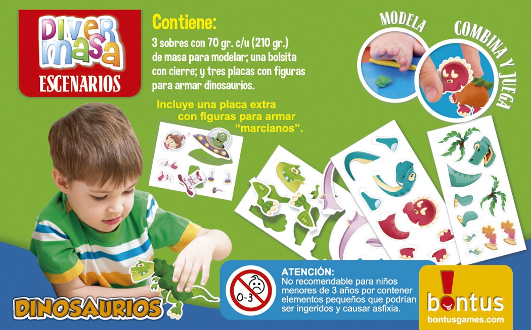 Con tres sobres de 70 gramos de Divermasa en colores primarios mezclables, una práctica bolsita con cierre para guardar la masa, y la fórmula no tóxica de textura suave y aroma agradable, este set es el regalo perfecto para los fanáticos de los dinosaurios que disfrutan crear con sus manos.