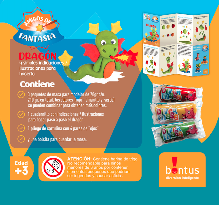 Dragón es un set de la línea Divermasa que desafía a los chicos a crear la más épica de las criaturas con sus propias manos. Siguiendo las indicaciones ilustradas del cuadernillo, van a moldear paso a paso un imponente dragón con alas, garras, cola y toda la ferocidad que su imaginación les permita.