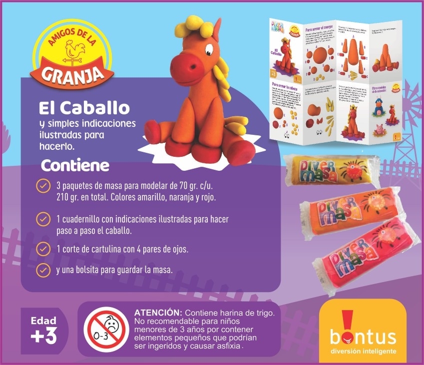 El Caballo es un set de la línea Divermasa que enseña a los chicos a modelar un elegante caballo siguiendo paso a paso las indicaciones ilustradas del cuadernillo incluido. Desde la forma del cuerpo robusto hasta la cola y la crin flotante, cada etapa del proceso es clara y accesible.