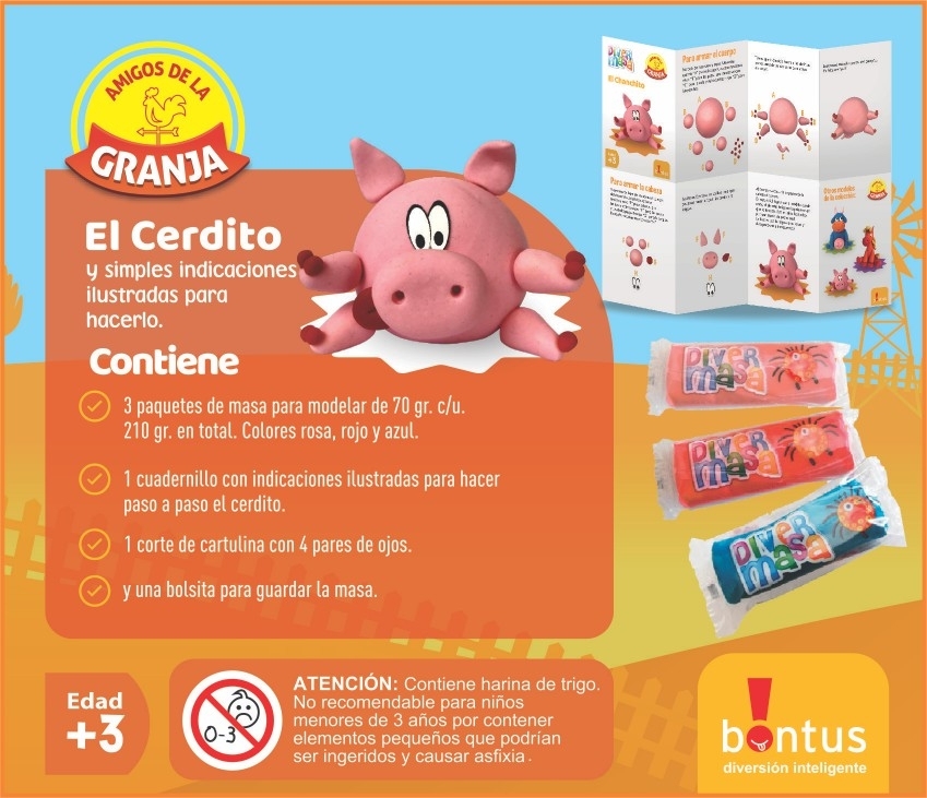 Con tres paquetes de 70 gramos de masa en colores rojo, rosa y azul, los pequeños artistas tienen la paleta perfecta para crear el rosa ideal del cerdito y todos los detalles que quieran agregar. Los ojos de cartulina incluidos completan la expresión tierna del personaje.