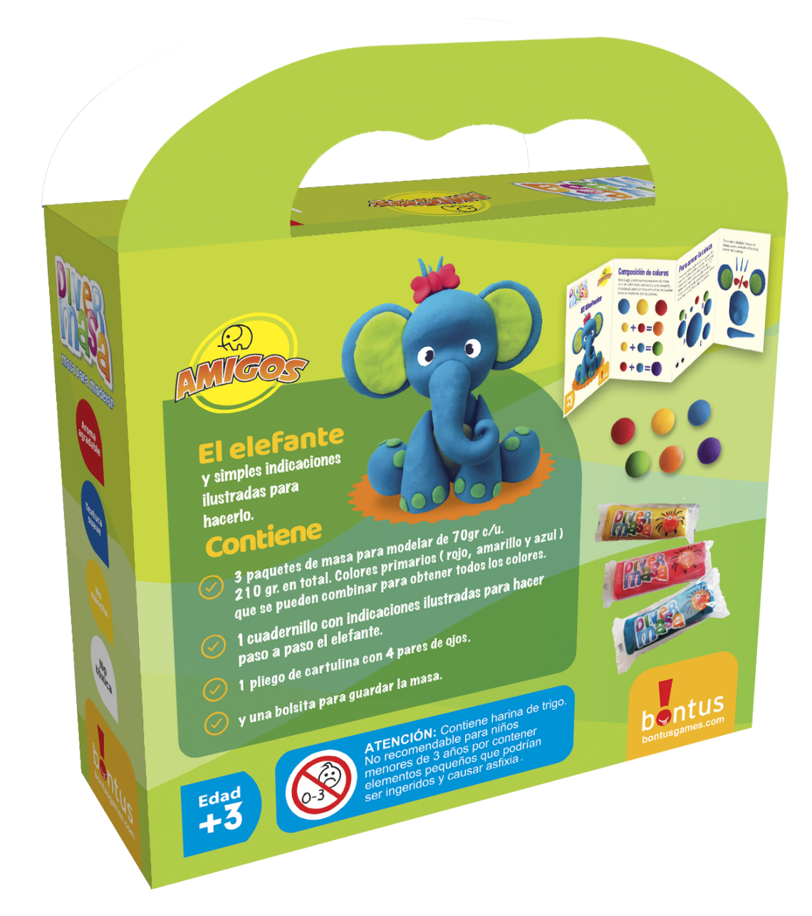 Con tres paquetes de masa de 70 gramos en colores primarios — rojo, amarillo y azul — los pequeños artistas pueden mezclar y combinar para obtener todos los colores necesarios para dar vida a su elefante. Los ojos de cartulina incluidos le dan el toque final de personalidad y ternura a la creación.
