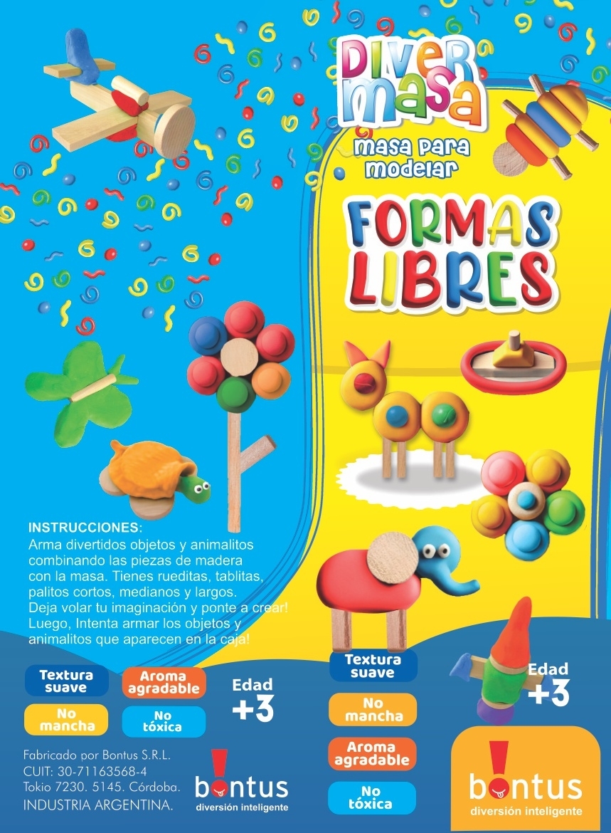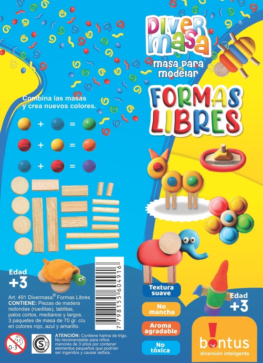 Formas Libres es un set de Divermasa que fusiona la versatilidad de la masa para modelar con la solidez de piezas de madera para crear construcciones ilimitadas. Con rueditas, tablitas y palos de diferentes tamaños, los chicos pueden armar desde animalitos hasta vehículos, edificios y todo lo que su imaginación les dicte.
