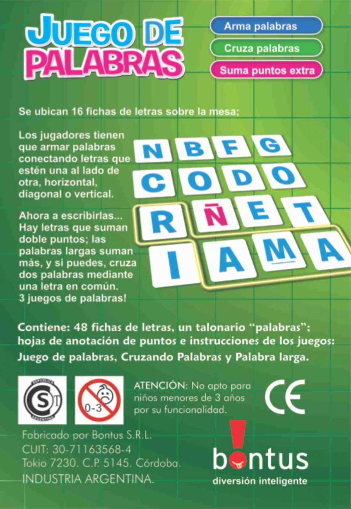 Juego de Palabras es un desafío lingüístico que pondrá a prueba tu vocabulario y tu agilidad mental. Se ubican 16 fichas de letras sobre la mesa y los jugadores deben armar palabras conectando letras que estén una al lado de otra, ya sea horizontal, diagonal o verticalmente. Parece simple, pero la disposición aleatoria de las letras convierte cada ronda en un rompecabezas único.