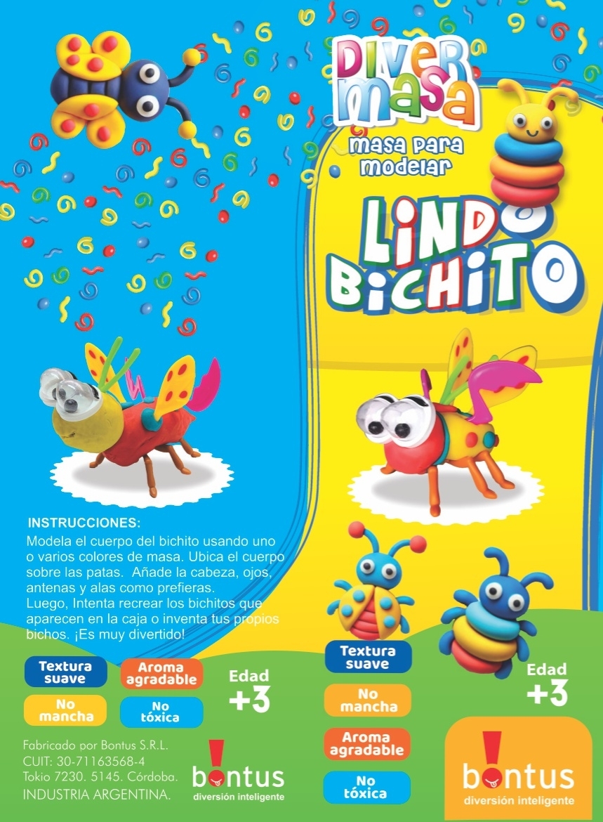 Lindo Bichito combina la creatividad de la masa para modelar con la diversión de armar un personaje único y lleno de personalidad. Los chicos modelan el cuerpo del bichito usando uno o varios colores de masa, lo ubican sobre las patas de plástico y luego le agregan la cabeza, ojos, antenas y alas como más les guste.