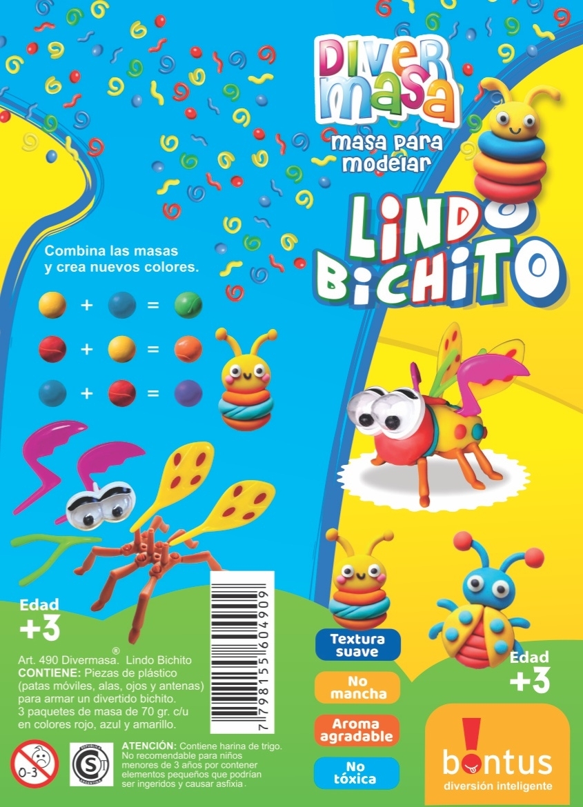 Con tres paquetes de Divermasa en colores primarios (rojo, azul y amarillo) de textura suave, aroma agradable y fórmula no tóxica, los chicos pueden mezclar colores para crear bichitos multicolores y extraordinarios. Una experiencia creativa que estimula la motricidad fina y la imaginación.