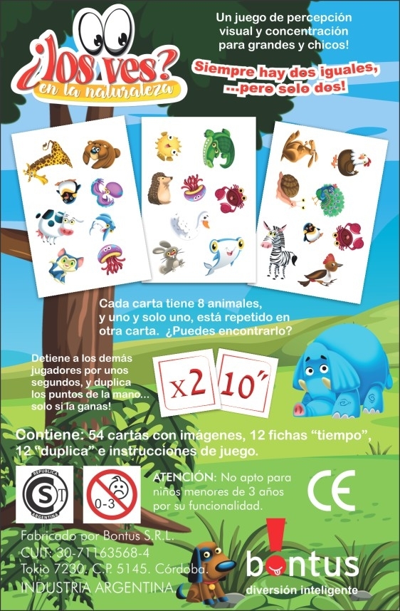 ¡Encontrá al animal repetido! Un juego de percepción visual con temática naturaleza donde cada carta tiene 8 animales y solo uno se repite en otra carta.