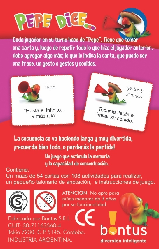 Pepe Dice es un desopilante juego de memoria y expresión corporal que pone a prueba tu capacidad de concentración mientras te hace morir de risa. Cada jugador, cuando es su turno, se convierte en “Pepe”: toma una carta y, después de repetir absolutamente todo lo que hizo el jugador anterior en la secuencia, debe agregar un nuevo elemento según lo que indica su carta.