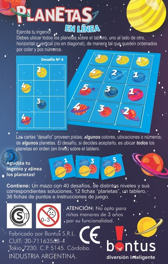 Ejercitá tu ingenio ubicando planetas en orden sobre el tablero siguiendo las pistas de las cartas desafío. ¡Alineá los planetas y resolvé el misterio espacial!