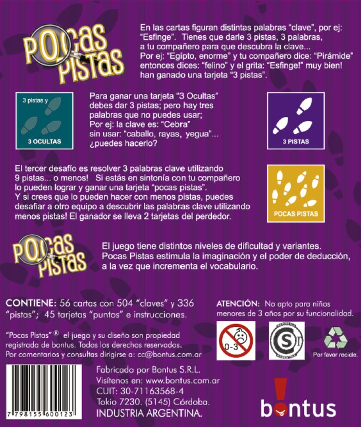 Si te encantan los desafíos de palabras, la deducción y la química con tu equipo, Pocas Pistas es el juego perfecto para ti. Diseñado para jugarse en parejas o equipos, este juego portátil pone a prueba la creatividad, el vocabulario y tu capacidad de asociación mental rápida.
